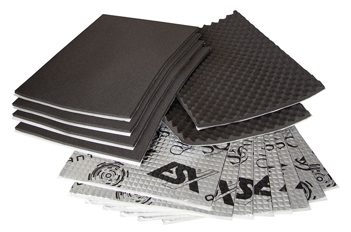 Both damping sets contain four sheets of flat QSC7 acoustic foam, two sheets of knubbed QSC15 acoustic foam and 8 sheets of aluminum butyl each. The inexpensive Quantum QDK1 contains the 1.8 mm thick Razor Mat aluminum butyl QRM18, which is completely sufficient for conventional systems and applications and already has very good insulating properties.