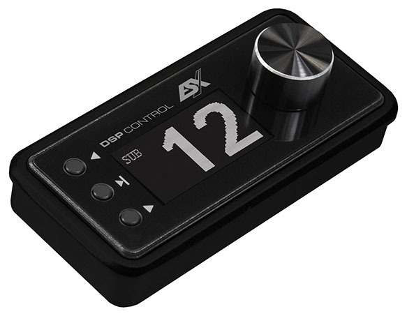 controls audio playback, input source selection, preset selection, sub and master volume adjustable
